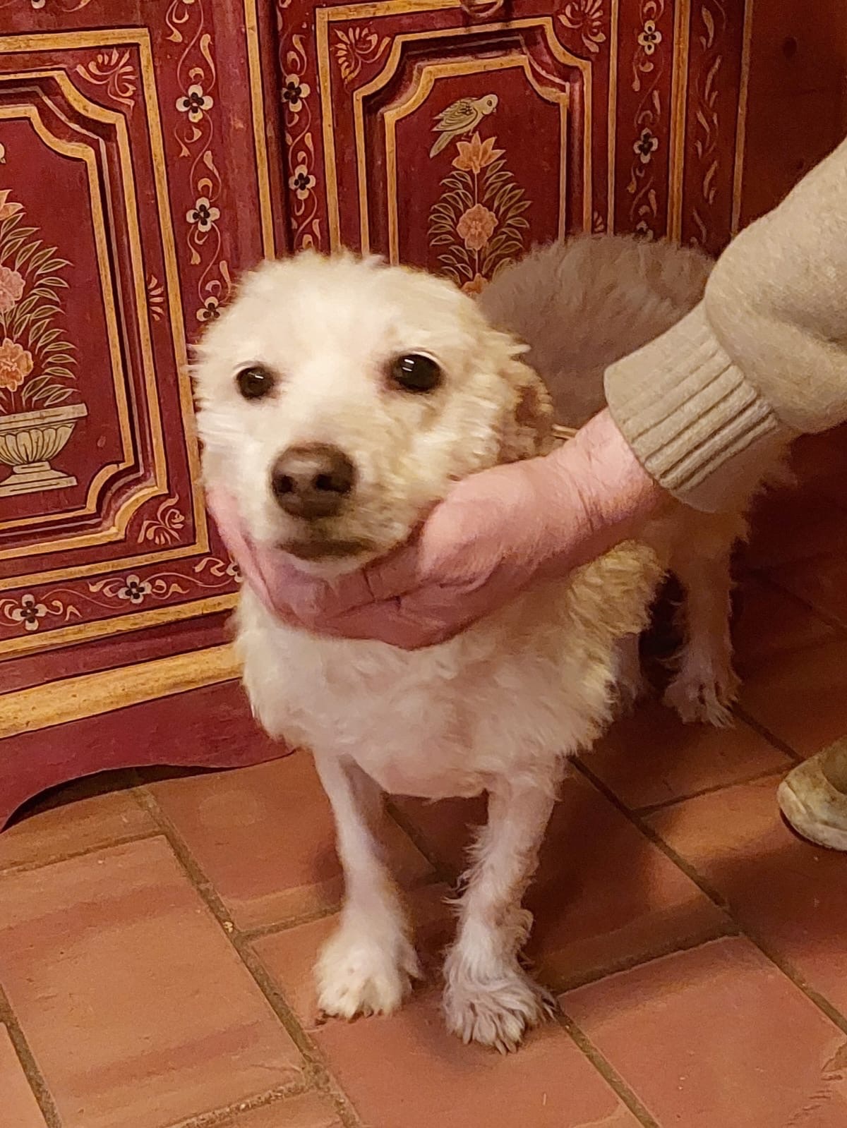 Calme et paisible, il a visiblement vécu en famille; Il se montre obéissant, connaît la laisse, apprécie les promenades et le confort de son panier